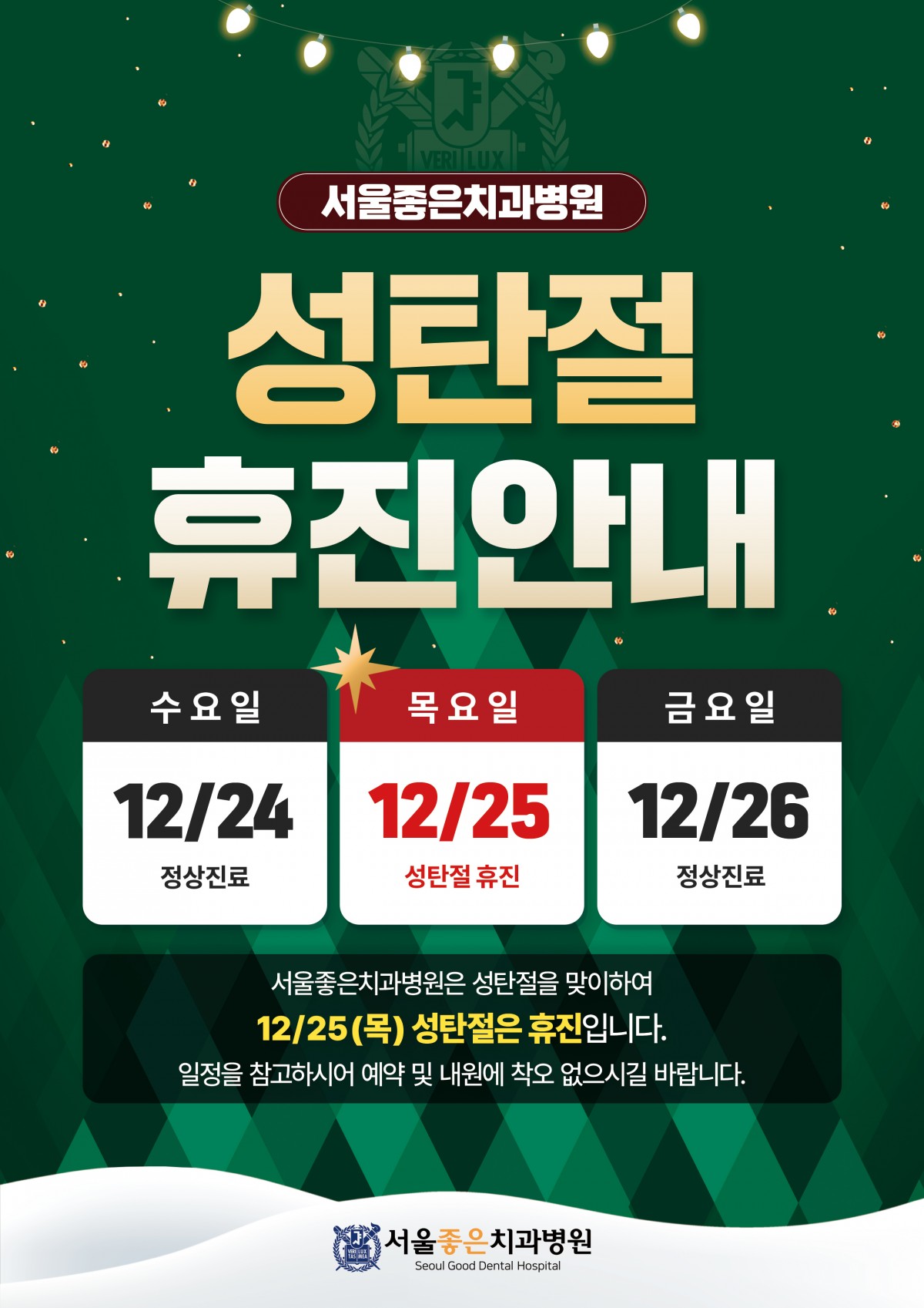 서울좋은치과병원은 12/25(목) 성탄절은 휴진입니다. 휴진일정 확인하시어 병원 이용에 착오 없으시길 바랍니다 :)