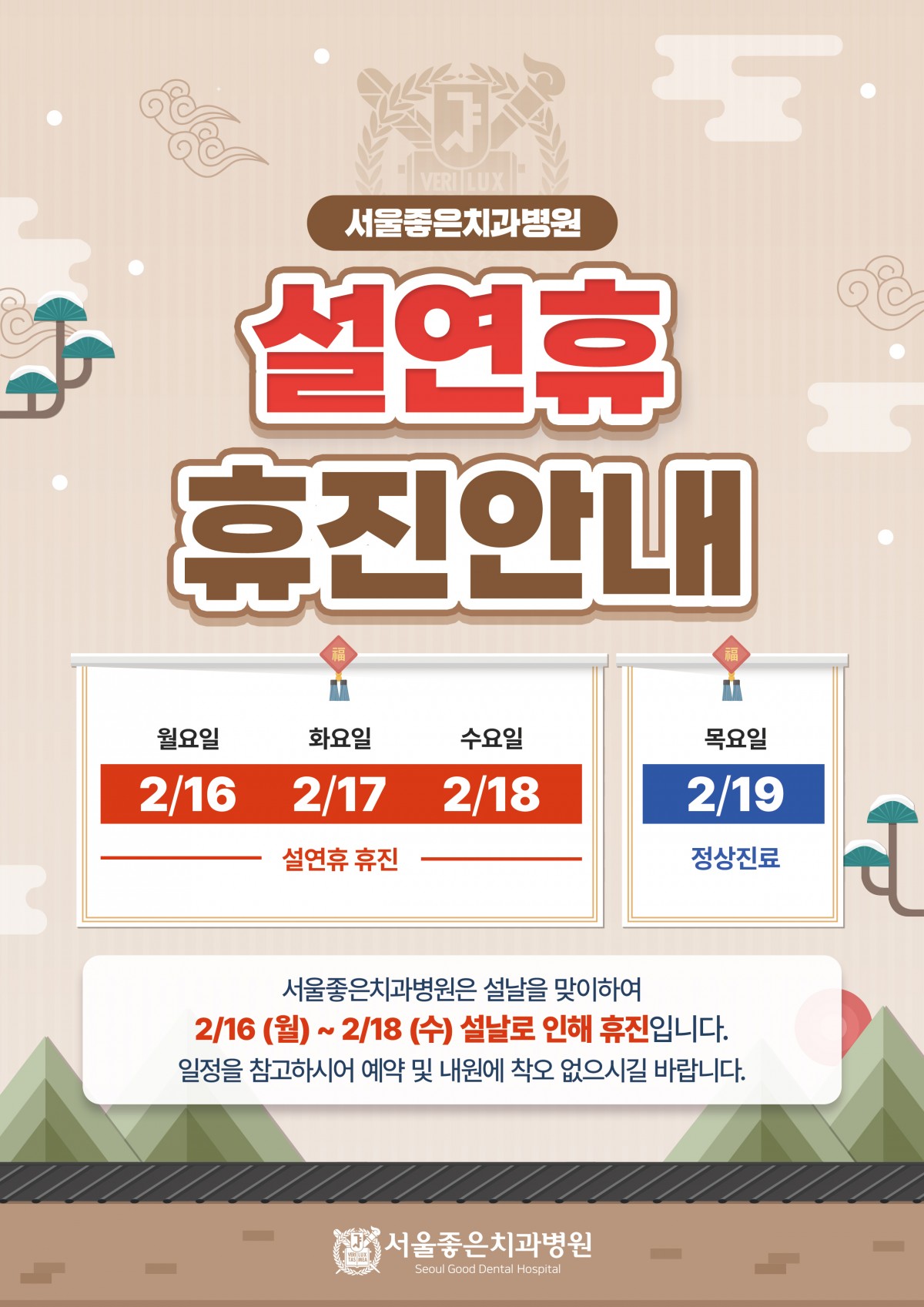 서울좋은치과병원은 설연휴를 맞이하여 2/16(월)~2/18(수) 휴진이며, 2/19(목)은 정상 진료합니다.