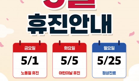서울좋은치과병원은 5/1(금) 노동절, 5/5(화) 어린이날은 휴진이며, 5/25(월)은 정상진료합니다.