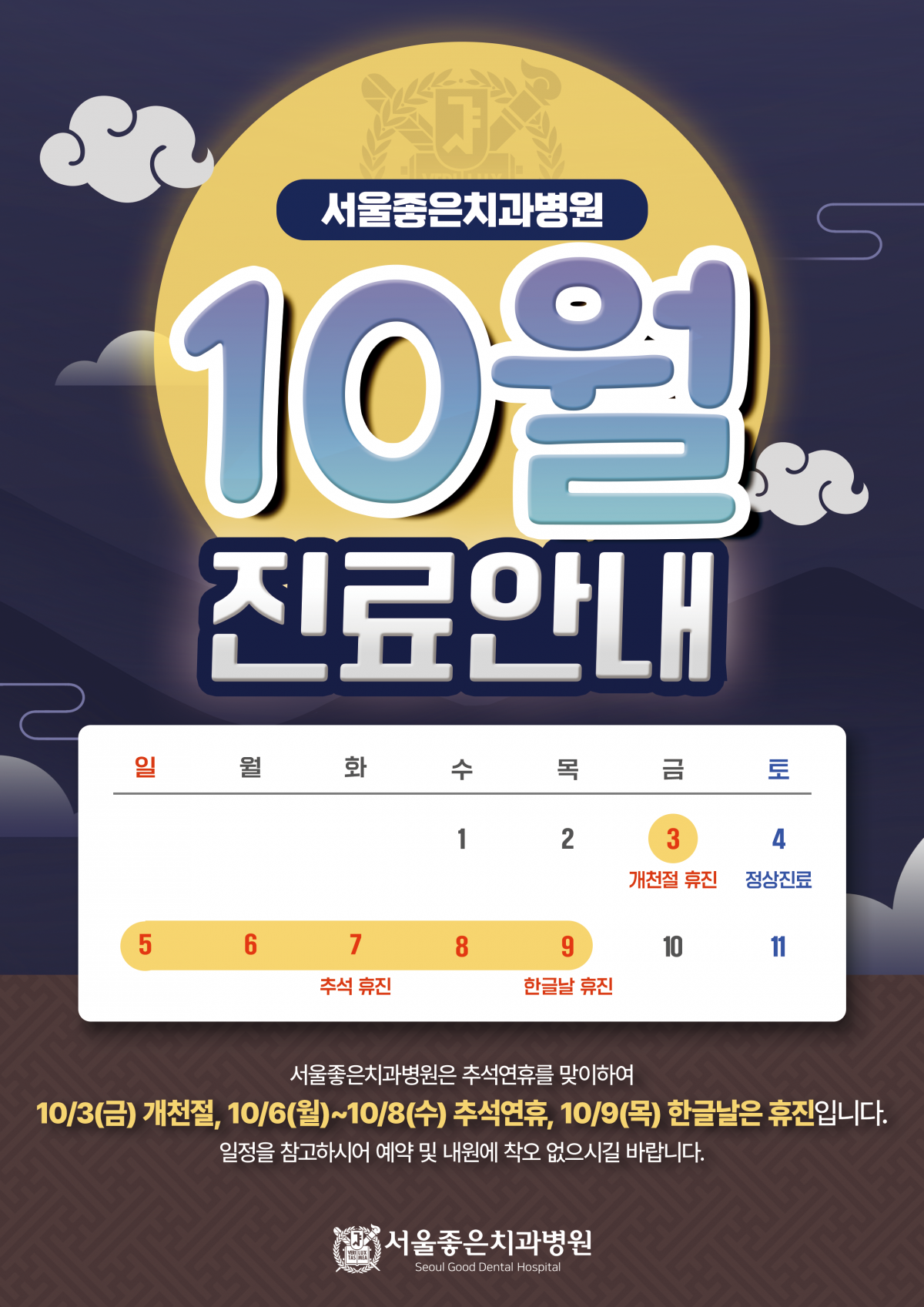 서울좋은치과병원은 추석연휴를 맞이하여 10/3(금) 개천절, 10/6(월)~10/8(수) 추석연휴, 10/9(목) 한글날은 휴진입니다.